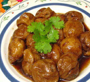 正統派!上海料理決定版! 油麺筋塞肉(揚げ麩の肉づめ):油麺筋(球状の揚げ麩)にひき肉をつめ、煮込んだ料理。