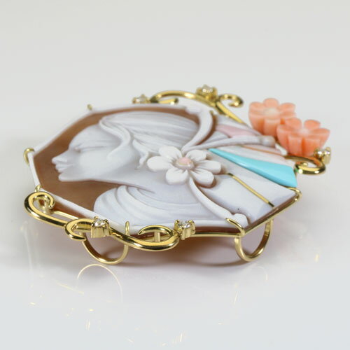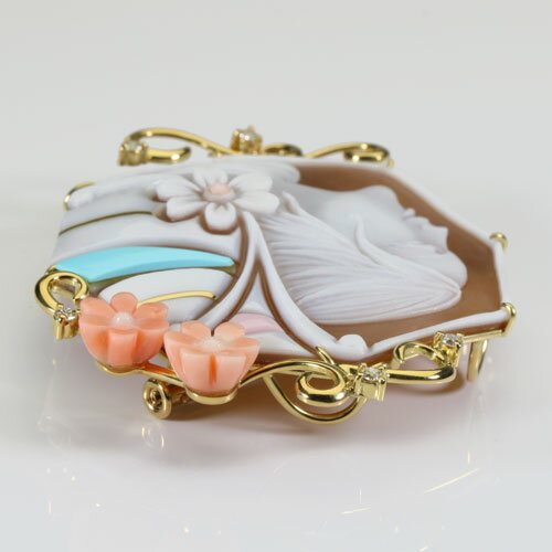 サイズ 横 5.0cm× 縦 5.4cm 重さ 14.9g 枠素材 K18 珊瑚種類 桃珊瑚(左上の花部分) トルコ石 コンクシェル ダイヤ 0.16ct 商品説明 カメオは、1974年イタリア ナポリ 生まれ ロザリオ・メンネッラ (Rosario Mennella)の作品です。